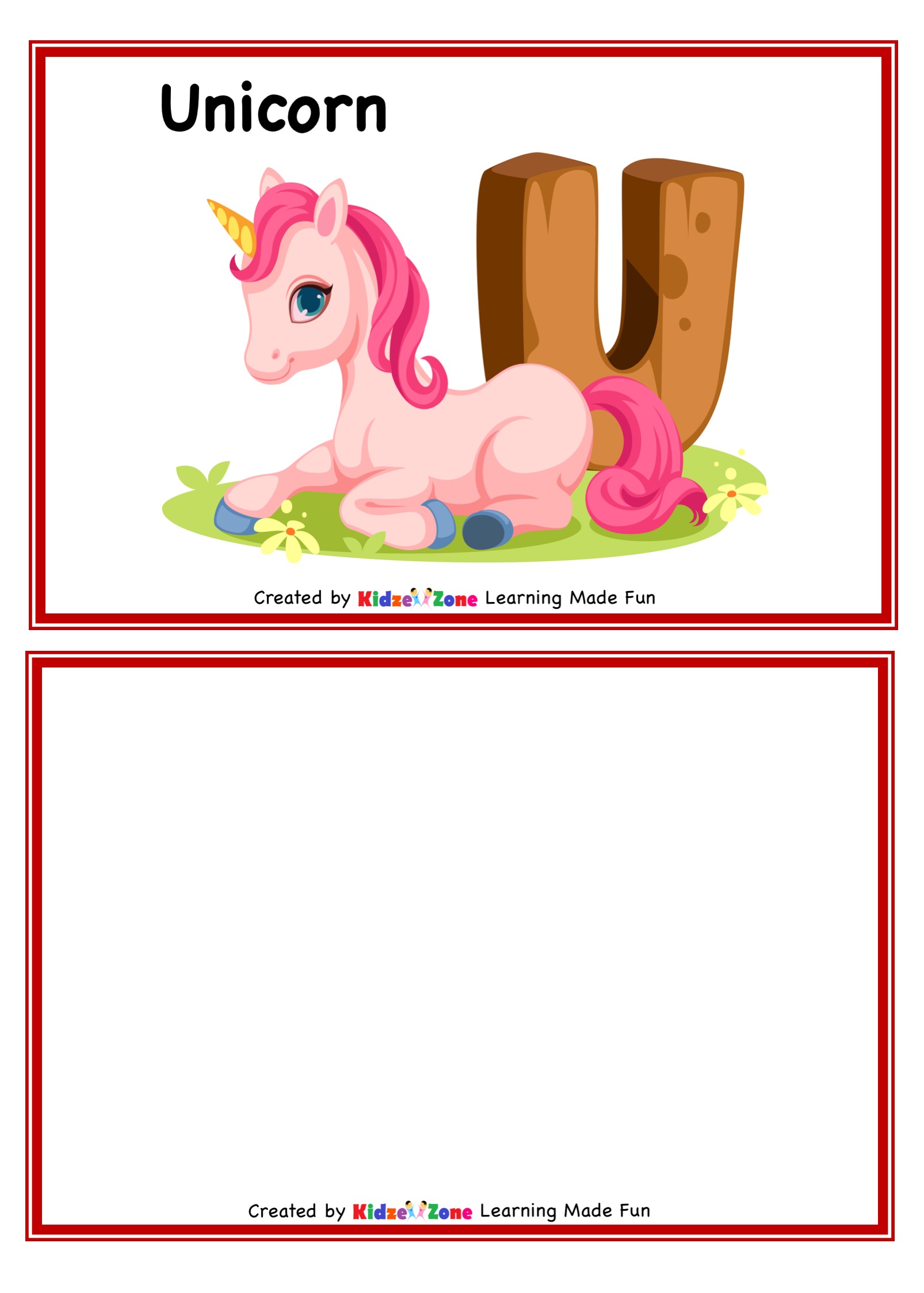 Expand child's letter recognition skills by linking letter to picture clues. Preschool and Kindergarten Letter U Flashcard worksheet. Read out the Letter, call out Unicorn and try to draw one. Help children in letter reading and memory skills.