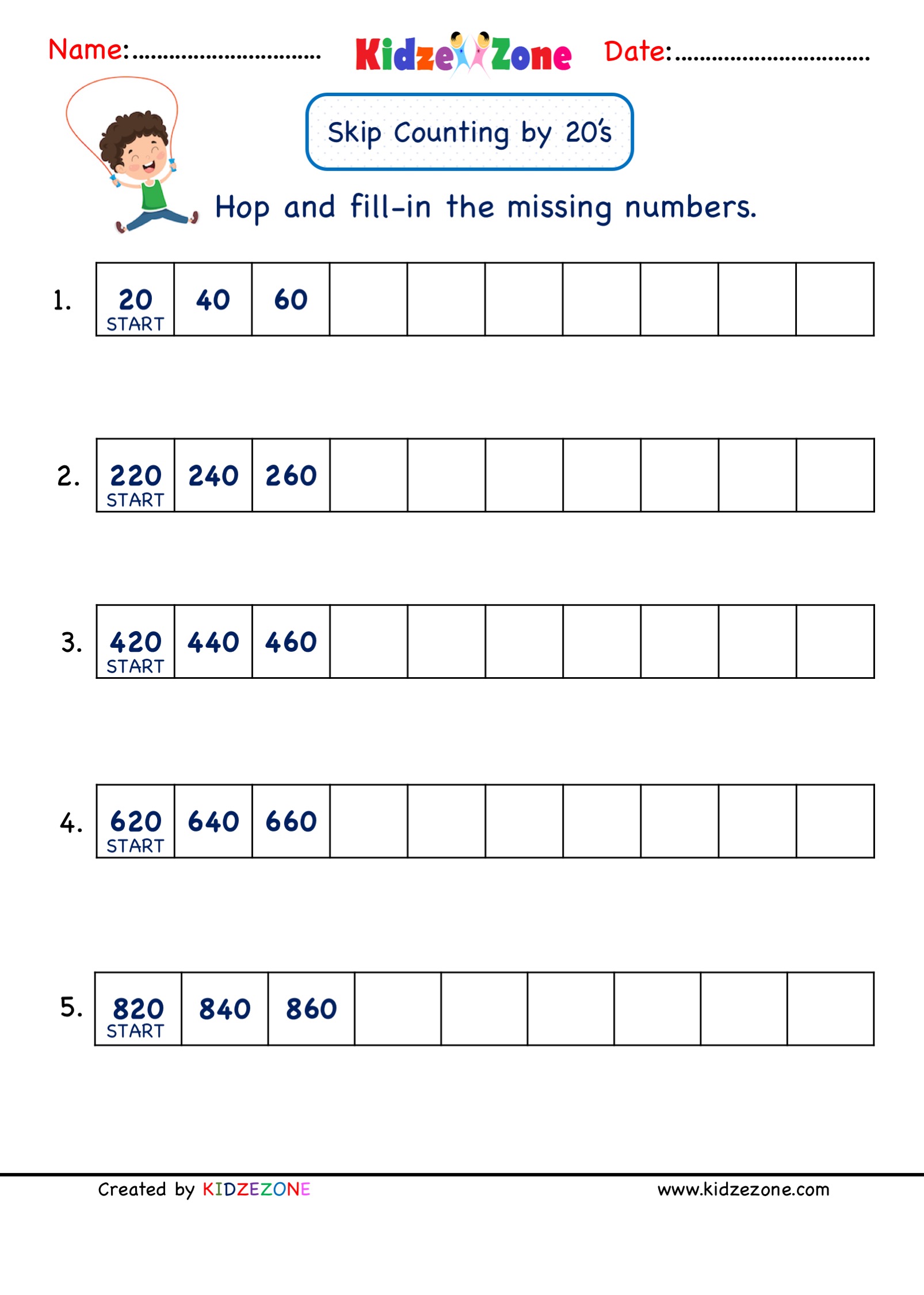 Math skip counting worksheets to practice and master skip counting by 20. Write the missing numbers in the number sequence by doing skip counting by 20. Download free printable for 2nd graders to practice and test skipping number by 20. Grade 2 math worksheet to supplement math lessons on skip counting.