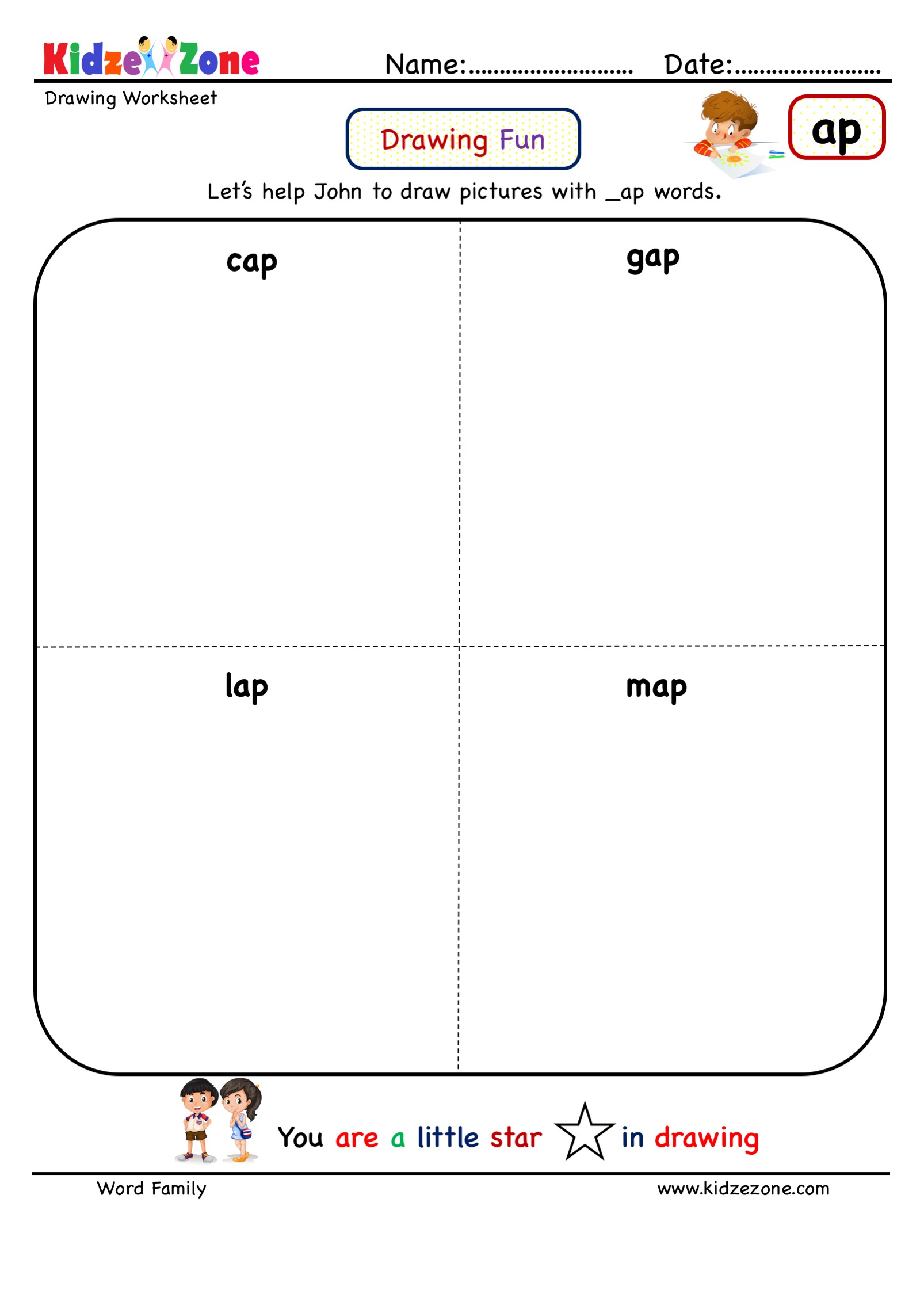 ap word family activity worksheet to draw pictures. After learning the sounds of the _ap word family, kids start learning the different activities related to them. In this worksheet, children can try to draw pictures of _ap words. Drawing pictures is the best way to memorize, recognize, and recollect the CVC and CCVC words they have learned so far.