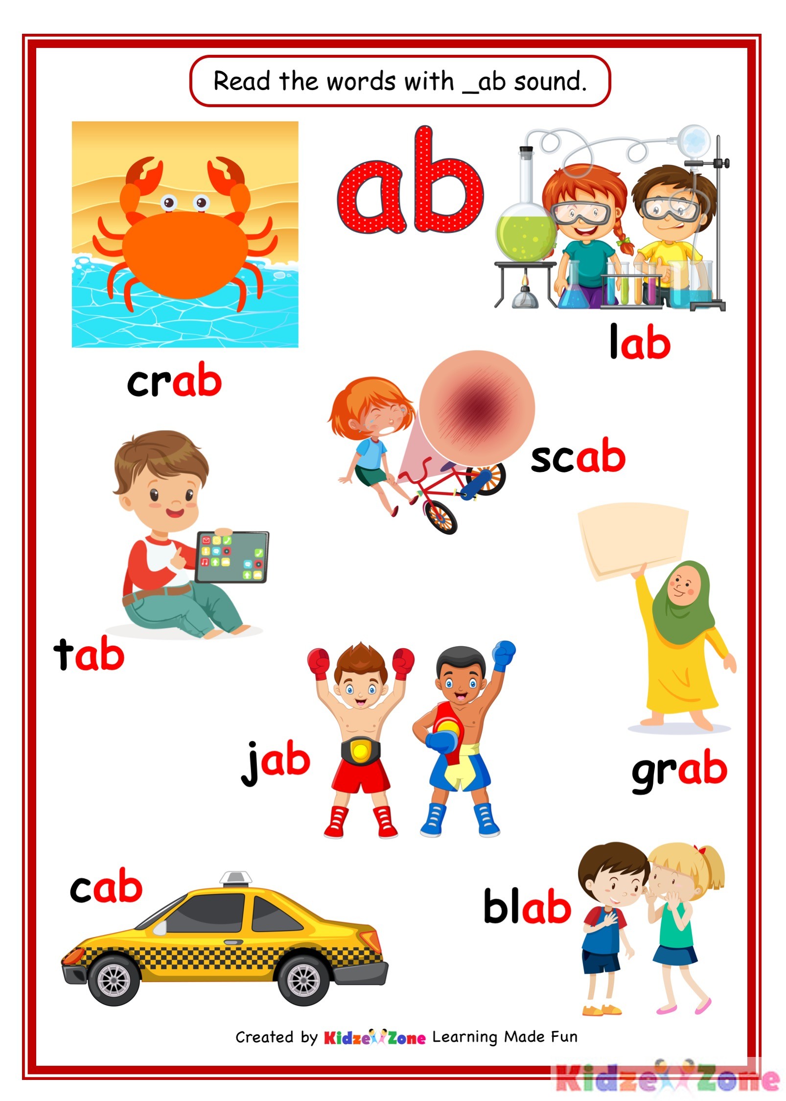 ab word family picture card. Word families are groups of words that have a common pattern in them. In _ab word family “ab” is the main sound. They are a groups of letters with the same ending, starting or middle sound . In this worksheet kids will learn to read and recognize ap words using picture clues and circle them. This will help kids to recollect and memorize the _ab words. It will also help them to understand the words better and use them correctly in sentences later. Read the words with ab sounds. Recognize word patterns with help of picture clues to learn spellings and expand vocabulary.